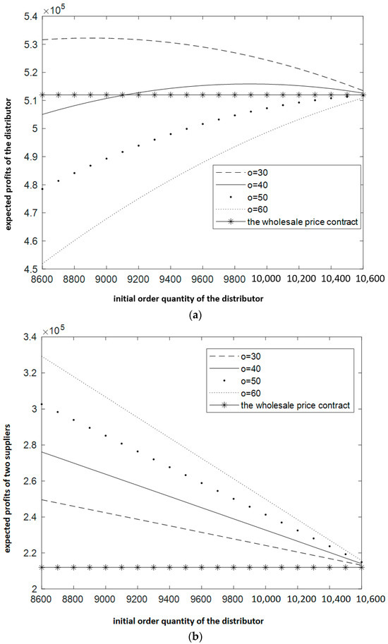 Figure 4b shows the relationship between the optimal expected profit of suppliers and the initial order quantity of the distributor when e = 160 and o varies equally between 30 and 60. From Figure 4b, we know that, for any order quantity, the higher the option price, the greater the profits of the two suppliers, while the profit of the suppliers is the least under the wholesale price contract. As the initial order quantity increases, the profits of suppliers continue to decline and eventually converge to a single point.
