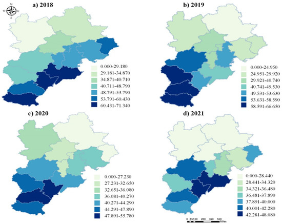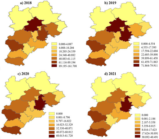 As shown in Table 6, the healthcare cost caused by PM2.5 in the BTH region decreased annually from CNY 64.246 billion in 2018 to CNY 16.095 billion in 2021, which is a decrease of 74.9%. The healthcare costs of O3 also decreased annually. In 2018–2021, the healthcare costs regarding ozone exposure decreased by only 33.3%, which is far lower than the healthcare costs of PM2.5. This is because the BTH region is mainly polluted by PM2.5, and the number of people affected by the long-term health effects of PM2.5 is higher. On the other hand, the number of people affected by the short-term health effects of O3 is higher, but the long-term healthcare costs are much higher than the short-term healthcare costs. In turn, PM2.5 healthcare costs in the BTH region are mainly caused by PM2.5 pollution, which are approximately 3.5 times greater than the healthcare costs caused by O3 pollution. Meanwhile, regarding the control of PM2.5 pollution, it is necessary to continue strengthening O3 pollution control. It is worth noting that the total healthcare costs caused by PM2.5 and O3 pollution in the BTH have shown a downward trend from 2018 to 2021. Regional healthcare costs decreased from CNY 77.085 billion in 2018 to CNY 24.652 billion in 2021, and as a proportion of the GDP from 0.98% to 0.26%. The BTH region has achieved remarkable results in the pollution control of PM2.5 and O3. To intuitively understand the changes in PM2.5 and O3 healthcare costs in the BTH region, a spatial distribution map of healthcare costs in the BTH region was drawn, as shown in Figure 8.