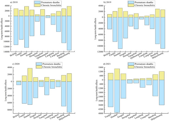 Figure 4 shows the long-term health effects of PM2.5 in BTH from 2018 to 2021. Shijiazhuang, Handan, Baoding, and Tianjin were the areas most affected by long-term exposure. In 2018, the number of people affected by long-term PM2.5 exposure was 108,100. With the continuous reduction in the PM2.5 concentration in 2019–2021, the number of people affected by negative long-term health effects in BTH decreased by 23.2%, 32.8%, and 53.6%, respectively, and the decline rate increased annually. The areas with the greatest decline in long-term health effects were Tangshan, Beijing, and Cangzhou. Based on the proportion of long-term health effects, the proportion of the two kinds of effects in each year was basically the same: patients with chronic bronchitis accounted for approximately 80%, and those who died prematurely accounted for 20%. Therefore, the long-term impact of PM2.5 on human health is mainly reflected in the onset of chronic bronchitis.