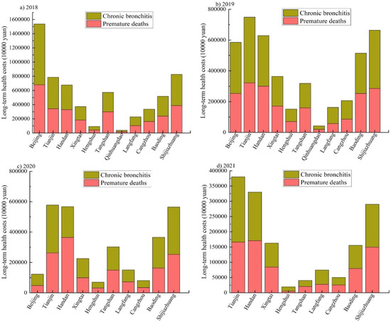 This study used the VSL value of BTH to estimate the economic impact of death. For chronic bronchitis, treatment is slow and affects people’s quality of life and spirit; therefore, it is difficult to estimate its healthcare cost through medical expenses such as hospitalisation and outpatient services. Referring to the recommendation of the World Bank [52], this study assumed that residents’ willingness to pay to avoid chronic bronchitis was equivalent to 32% of the local VSL. Figure 6 shows the long-term healthcare costs of PM2.5 exposure in BTH from 2018 to 2021.