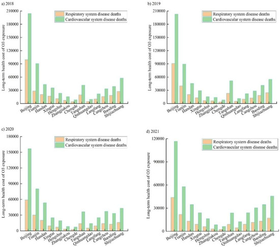 Figure 5 presents the long-term health effects of O3 in the BTH region from 2018 to 2021. The total number of regional deaths caused by O3 decreased annually, and the number of people affected by long-term health effects in 2018–2021 was 7391, 6717, 5673, and 4282, respectively. Among these, the death toll from cardiovascular disease accounted for approximately 68% of the long-term impact, which is the health impact most affected by ozone exposure, and excessive O3 concentrations increased the death rates correlated with cardiovascular diseases. From the perspective of cities, the cities most affected by long-term health effects were Beijing, Tianjin, Shijiazhuang, and Baoding, and their health effects accounted for more than 48% of the total health effects in BTH.
