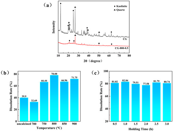 (a) XRD pattern of CG before and after calcination at the optimal temperature; (b) alumina-dissolution rate of CG with different temperatures; (c) alumina-dissolution rate of CG with different holding times.