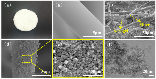 The microstructure of ASF/AA without heat treatment is shown in Figure 3a–f. As can be seen from the macroscopic picture in Figure 3a, ASF/AA is relatively intact, with no significant surface cracking. Figure 3b is an electron microscope scan image of a single bundle of fibers after pickling. The surface is smooth and devoid of imperfections, as can be seen. Figure 3c exhibits the internal structure of ASF/AA composites. The aluminum silicate fibers are disordered in the aerogel, acting as a support skeleton, while the large pores between the fibers are filled by the Al2O3 aerogel with mesoporous pores, and the surface of aluminum silicate fiber is coated with a layer of aerogel, which indicates that the method of high-speed mechanical agitation assisted in thoroughly mixing alumina sol with fibers; a uniform composite sol was obtained (Figure 3d). At the same time, micrometer gaps are visible between the aluminum aerogel (AA) and fibers. In the drying process of gel, aerogel will shrink to some extent. The aerogel will be broken and cracked. The aerogel combined with the fiber may be separated, resulting in gaps between the aerogel and the fiber, and eventually forming micron-sized pores [37]. Additionally, Mizushima et al. [38] found pores with a pore size of 1–10 μm in SiC whisker-reinforced AA, suggesting that these pores originate from cracks in AA in composite materials. For the majority of porous materials, their strength depends on the image composition and microstructure, especially the porosity [39]. The microstructure of AA is depicted in Figure 3e, f, where SEM (Figure 3e) shows that the alumina aerogel compounded by fiber is still a network porous structure formed by the accumulation of nanoparticles, and the TEM (Figure 3f) image displays that the 10–20 nm spherical Al-O-Al particles of AA form a three-dimensional network structure with a uniform mesoporous structure.