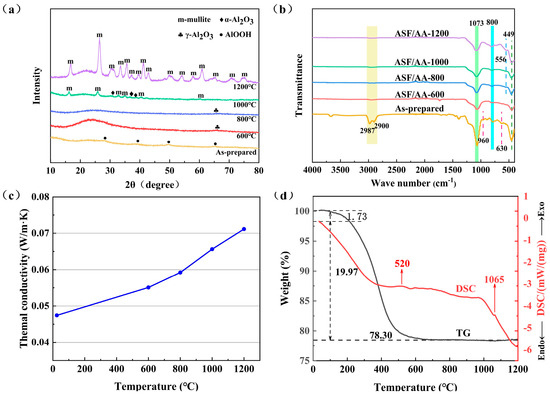 The heat-treated composite materials’ high-temperature thermal resilience was examined by putting them through a variety of tests. The thermal conductivity of ASF/AA at 600, 800, 1000, and 1200 °C, both before and after heat treatment, is displayed in Figure 4c. As the temperature rises, so does the thermal conductivity. When the temperature increases, the thermal movement of solid molecules in ASF/AA is enhanced, while the heat conduction of air in the pores of the material and the radiation between the pore walls are also increased, especially at high temperatures. The thermal conductivity of ASF/AA is 0.047 W/(m·K) at room temperature and 0.071 W/(m·K) after treatment at 1200 °C, which indicates low thermal conductivity in fiber/aerogel composite insulation materials [47]. This can be explained by the microstructure (Figure 3c). The aerogels filled in the space between the fibers, making the composite obtain a mesoporous structure and effectively reducing the thermal conductivity. The TG-DSC curve of AA increased from ambient temperature to 1200 °C in an argon environment is displayed in Figure 4d. Between 20 °C and 1200 °C, the mass loss rate is 21.7%. There are three primary stages to the thermal imaging curve. The desorption of a tiny amount of physically adsorbed water and leftover organic matter is the primary cause of the weight loss of 1.73% that happens in the first stage between ambient temperature and 200 °C. In the second stage, 19.97% of weight loss occurs in the temperature range of 200 to 700 °C, and a broad endothermic peak appears at 520 °C. This is due to the oxidation of Po-derived CH3 and the transition from boehmite crystals to γ-structural transformation of Al2O3 (2AlO (OH)) → γ-Al2O3 + H2O, 300–980 °C) [48]. The third stage is 1000 °C to 1200 °C, during which there is almost no weight loss, and there is an exothermic peak at 1065 °C. The exothermic peak is prepared by the mullite phase transition (3Al2O3 + 2SiO2 → 3Al2O3·2SiO2) at an elevated temperature [47,48]. In accordance with the TG-DSC curve, the accompanying XRD patterns also show that the mullite phase first appears at 1000 °C.