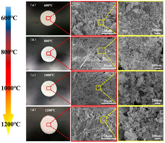 The SEM images of the ASF/AA composites at various temperatures following heat treatment are displayed in Figure 5a–d. The optical images demonstrate that after being calcined at various temperatures, the samples’ morphology did not shrink or destruct. The SEM image of AA at 600 °C after heat treatment is shown in Figure 5a, where the aerogel particles are flat. The SEM picture of the aerogel treated at 800 °C is displayed in Figure 5b. At this time, the aerogel particles have more fragmentation and reaggregation phenomena, and the sheet structure appears. With the increase in pore size, the overall pore structure becomes loose, the pore size increases, and the corresponding specific surface area decreases [49]. After being treated at 1000 °C (Figure 5c), the pores in the figure are larger, the structure is further loosened, and the layered structure is more obvious. A large number of nanoparticles accumulate randomly to form relatively dense aggregates, and the appearance of new AA crystals will also produce a pore structure, the pore size distribution is not uniform, but still a mesoporous structure. At 1200 °C (Figure 5d), the particles become larger and denser, with a smooth appearance. This results from the mullite fossilization of SiO-Al particles [50]. Although another part of the pore structure is destroyed and collapsed, the microstructure of AA still appears as a porous structure [51].