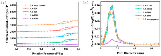 Figure 6 displays the N2 adsorption and desorption isotherms of BJH after heat treatment with AAs at different temperatures (Figure 6a) and the pore size distribution curve (Figure 6b). The isotherms of the composites treated at 600, 800, 1000, and 1200 °C are similar, all of which are type IV isotherms with H1 hysteresis curves. This is generally caused by typical capillary condensation occurring in mesopores [52]. This indicates that under high relative pressure (P/P0 = 0.70–0.98), the sample still maintains the mesoporous structure characteristics of cylindrical holes after heat treatment at various temperatures. When the heat treatment temperature is 1200 °C, the area of the hysteresis ring on the adsorption–desorption isotherm decreases obviously, and the mesoporous structure of the sample decreases obviously, which corresponds to the aperture distribution. According to the pore size distribution, the average pore size of the sample without heat treatment is 8.35 nm, and the pore size distribution is narrow. After heat treatment at 600 °C and 800 °C, the average pore diameter of the sample was 10.04 nm and 11.22 nm, respectively. Micropores disappeared and pore size distribution widened. This occurred 12.04 nm after heat treatment at 1000 °C and 13.54 nm after heat treatment at 1200 °C. The reason for this phenomenon is that due to the expansion and merger of AA particles and the merger and collapse of pores, new pores are formed, resulting in a larger average pore size. It is further proved that the samples are composed of mesoporous structures of different sizes. The pore size of 2–5 nm is formed by a large number of intergranular connections. The pore size of 10–50 nm is a nanoparticle formed by connecting clusters of the following components [53]. The prepared AA had a specific surface area of 608 m2/g. The specific surface area attained under supercritical drying conditions is equal to that of AA. Hernandez et al., for instance, created AA via super-critical drying with a specific surface area of 662 m2/g [54]. The specific surface area decreases as the particle size increases with temperature. The materials retain their mesoporous structure even after heat treatment at varying temperatures, with pore sizes ranging from 2 to 50 nm, while still retaining the mesoporous structure. Furthermore, this aperture is smaller than the typical free path of air molecules, which is 69 nm [55]. As a result, the prepared sample can effectively inhibit the generation of gas heat conduction and convection, and achieve a good thermal insulation effect.