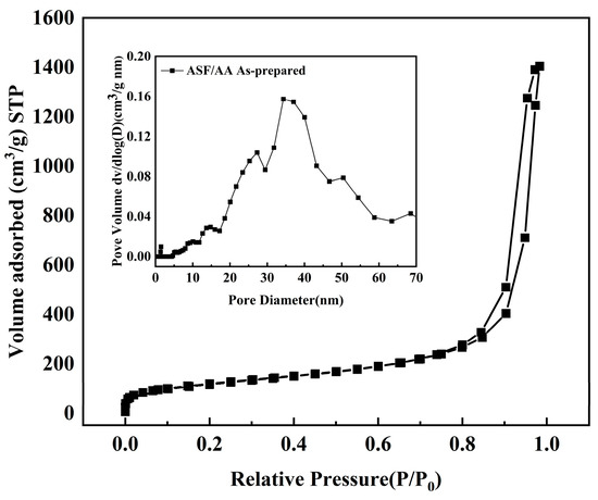 As can be seen in Figure 7, ASF/AA and alumina aerogels have pore structures that are comparable to one another. Both composites correspond to type IV isotherms with H1 hysteresis curves, demonstrating that they are also mesoporous materials. The composite has a specific surface area of 416 m2/g, which is less than that of pure alumina aerogel. The composite has bigger pores than pure alumina aerogel, with a concentrated range of 20–50 nm in size. This demonstrates that the aerogel’s pore structure was unaffected by the addition of fibers.