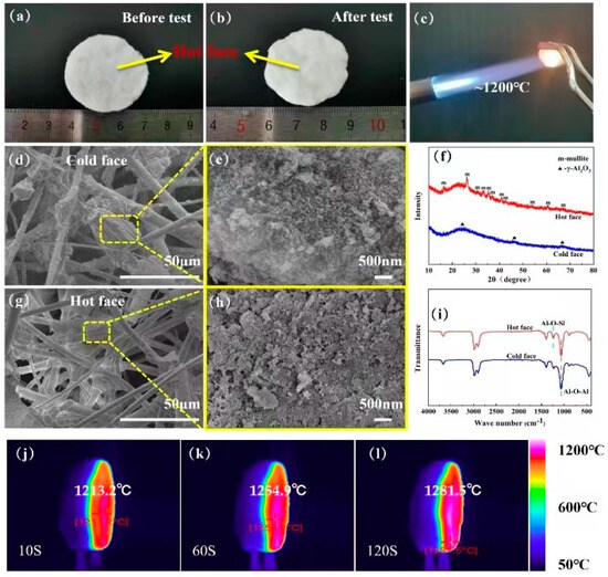 In an air environment, a single side of ASF/AA was heated with a butane spray gun (1200 °C for 20 min with a sample thickness of 10 mm (Figure 8c)). As shown in Figure 8a,b, no macroscopic damage occurred before and after heating of the sample, but a certain shrinkage occurred. At the end of the experiment, there was a gap between the aerogels and fibers on the hot and cold face (Figure 8d,g), and the aerogels (slightly contracted) still maintained their leaf-like morphology and mesoporous structure (Figure 8e,h). The hot and cold sides of the sample were measured via XRD and FTIR. The results of XRD (Figure 8f) show that the mullite phase diffraction peak appears on the hot side and the AlOOH diffraction peak appears on the cold side. As shown in Figure 8i, the absorption peak of Al-O-Si appeared on the hot side of the sample, and the mullite phase was formed on the hot side.
