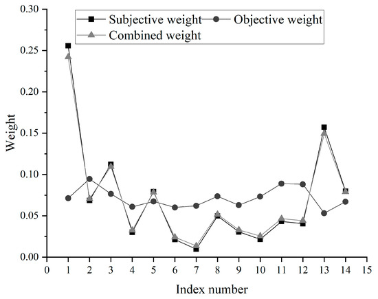 Weights obtained using the optimized hierarchical analysis method and optimized entropy weight method are denoted as w1 = (w11, w12, …, w1N) and w2 = (w21, w22, …, w2N). A linear combination of and is then used to form the combined weight, as represented by the following formula: