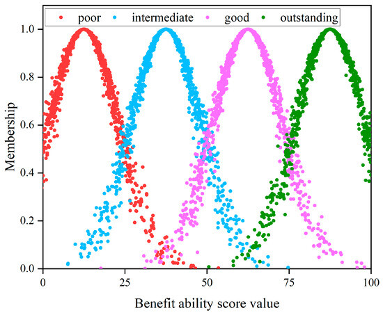 This integral stage involved the synthesis of the cloud’s individual digital features. In conjunction with the previously determined combined weights of the indicators, the overall digital feature values of the cloud were derived, specifically denoted as 84.28, 6.12, and 2.03, utilizing Formula (24). A subsequent step involved the utilization, where a setting of 1000 evenly distributed cloud droplets was implemented to construct the comprehensive benefit evaluation cloud image. This visualization is elucidated in Figure 4.