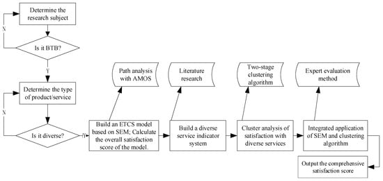 To address the limitations of traditional CSE models based on SEM in measuring satisfaction with diverse services, an evaluation method combining SEM and a two-stage clustering algorithm was applied in this study. The evaluation process of the optimization model for BTB CSE is shown in Figure 1, which includes the following important steps: