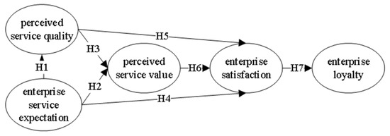 The paths in the model are explained as follows: H1: Enterprise service expectation has a positive direct impact on perceived service quality. H2: Enterprise service expectation has a positive direct impact on perceived service value. H3: Perceived service quality has a positive direct impact on perceived service value. H4: Enterprise service expectation has a positive direct impact on enterprise satisfaction. H5: Perceived service quality has a positive direct impact on enterprise satisfaction. H6: Perceived service value has a positive direct impact on enterprise satisfaction. H7: Enterprise satisfaction has a positive direct impact on enterprise loyalty.