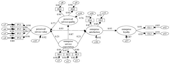 The standardized path coefficients among the variables and the model hypothesis results are shown in Table 9 and Figure 3. According to the impact pathways presented in Table 9, it is evident that enterprise service expectation has a positive impact on perceived service quality, thus confirming hypothesis 1. Enterprise service expectation has a positive impact on perceived service value, thus confirming hypothesis 2. Perceived service quality has a positive impact on perceived service value, thus confirming hypothesis 3. Enterprise service expectation has a positive impact on enterprise satisfaction, thus confirming hypothesis 4. Perceived service value has a positive impact on enterprise satisfaction, thus confirming hypothesis 6. Perceived service quality has no direct impact on enterprise satisfaction, meaning that hypothesis 5 is invalid. The standardized path coefficient of enterprise satisfaction on enterprise loyalty is 0.933, indicating that an increase in enterprise satisfaction causes greater enterprise loyalty, thus confirming hypothesis 7.