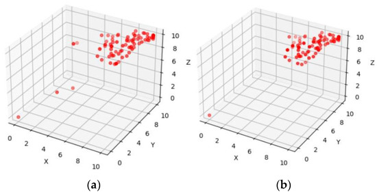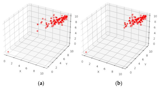 There were a total of 106 valid questionnaires for park A. Throughout the clustering process, the distance calculation of the KNN algorithm was used to determine the inflection point of 1.03 at K = 4. With an input radius of ε = 1.03 and a threshold of MinPts = 4, the clustering was more satisfactory, and the satisfaction results were clustered into one cluster. A total of seven noise points were generated during the process. Figure 4a,b show the satisfaction results for park A before and after eliminating the noise points in three dimensions. In Figure 4, the coordinate origin is (0, 0, 0), the X-axis represents the basic protection services dimension, the Y-axis represents the park management services dimension, and the Z-axis represents the comprehensive development services dimension.