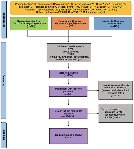 The screening phase, pivotal to the systematic review, involved a thorough evaluation of the collected articles to filter out irrelevant data. Rayyan (a web and mobile app for systematic reviews) was used in the screening process, which included automatic duplicate removal, exclusion of non-journal articles, and a meticulous review of titles, abstracts, and full texts to ensure relevance to the study’s core focus on mining heritage reuse risk assessment. We first used Rayyan to automatically identify and rejected items that appeared in more than one database, and 46 duplicates were founded and deleted. Additionally, we adopted journal articles only, and excluded 80 review articles, book chapters, and conference proceedings. In order to identify relevant articles, a total of 168 studies were examined, and this screening process for the database papers involved examining the title and the abstract of each paper. Those studies that were not directly related to mining analysis were eliminated during this phase. Further screening involved screening their abstracts for relevance to mining heritage reuse analysis. During this phase, some papers were excluded because they focused on topics of chemical properties, pollution, soil properties, and biological aspects that were not directly related to the mining heritage reuse analysis. We obtained 35 articles after the second literature screening. We then conducted a third screening, the full-text reading, to ascertain whether the 35 articles we had screened were closely linked to the risk assessment that our current study was focusing on. For the full-text reading process, 1 article’s full text was unable to be retrieved, thus being excluded. Later, the exclusion and inclusion criteria (Table 3) were applied to examine whether the remaining 34 articles addressed risks in mining heritage reuse (Appendix A). We determined which works were closely related to the topic based on our expertise and familiarity with the literature. To address subjectivity and mitigate potential biases during the third screening phase, we adopted consensus-based decision-making, discussing and deliberating on each potential inclusion, thereby reducing individual biases. Further, in aiming to reach agreement through open dialogue and collaboration, we enlisted subject matter experts to validate our selections. Following a rigorous multi-stage screening process, we narrowed down the selection to 12 full-text articles that closely aligned with our research objectives. The comprehensive literature search and screening process, meticulously documented in a flow diagram (Figure 1), underscores the methodical approach adopted in this study to ensure a thorough and unbiased review of the available literature on risks associated with mining heritage reuse, which sets the stage for a detailed analysis and discussion on risk assessment in mining heritage reutilization.