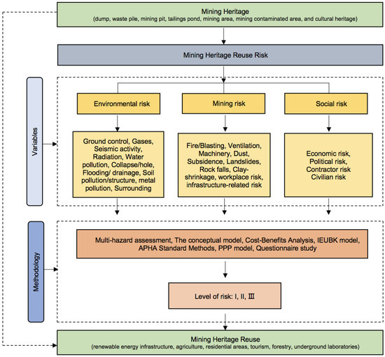 Finally, to achieve sustainable development of mining legacies, rigorous risk assessment processes are essential for projects involving the reuse of mining heritage (dumps, waste piles, mining pits, tailings ponds, mining areas, mining-contaminated areas, and cultural heritage) into renewable energy infrastructure, agriculture, residential areas, tourism, forestry, and underground laboratories. Building upon the findings and discussions presented, a systematic evaluation framework has been constructed to elucidate and comprehend the risk assessment process in mining heritage reuse (Figure 2), catering to a diverse array of stakeholders [64], such as government agencies, local communities, industry stakeholders, environmental organizations, and the academic and research community, in their efforts of transforming mined territories into greener and sustainable spaces. The initial step involves articulating the objectives of the risk assessment, including the specific aspects of mining heritage reuse to be evaluated. Then, suitable methodologies for risk identification and assessment are chosen, considering factors such as the scale of the project, available data, and stakeholder input, incorporating quantitative and qualitative approaches as needed. Lastly, the likelihood and consequences of identified risks are evaluated, and risks prioritized [65] based on their significance and potential impact on the objectives of the reuse project. Risk levels in mining heritage reuse projects are typically categorized from lowest to highest, denoted as level I to level III [14,26,40,41,43]. Level I indicates minimal or low risks throughout the project duration, signifying reasonable risk levels. Level II suggests a few or some risk occurrences during the project, indicating potential issues in mining heritage repurposing. Projects marked with Level III signify higher or significant risk levels during the project duration. Accurate identification of risk levels enables the anticipation, avoidance, and resolution of potential problems in mining heritage projects, ensuring smooth progress and timely completion.