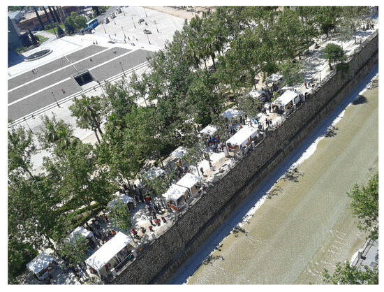 The Ecomercado is located on a walkway near Palacio de Congresos, a central area of the Granada capital city (population of 243,059 in 2021) [19] (Figure 1). Moreover, since 2013, this farmer’s market has been held on the first Saturday of every month including an average of 20 selling tents set up. After 2017, the farmer’s market is also celebrated every third Saturday of the month in the north area of the city (near the bus station) but with only 10 selling tents. The Ecomercado offers a pathway for local consumption of organic food and other complementary products ranging from books and clothes to fair trade products. It also offers a space for civil society organizations such as neighborhood associations, territorial defense entities, organizations that fight against climate change, etc.