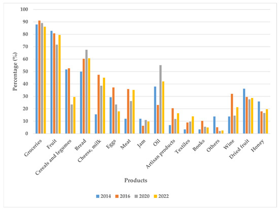 In terms of the evolution of the products purchased, there are some noteworthy aspects. Firstly, it stands out that most of the products purchased by consumers had a significant decrease in 2020. This is probably due to the restrictions that existed to attend the Ecomarket during this year due to COVID-19. The products that declined the most were cereals and legumes, wine, and eggs, which decreased between 2016 and 2020 by 29.1%, 17.6%, and 13.7%, respectively. The products that decreased more moderately were honey (1.3%), dried fruit (1.9%), and groceries (2%). Bread, ham, oil, and textiles increased their purchases. The purchase of oil is notorious with an increase of 32.1%.