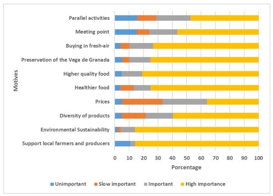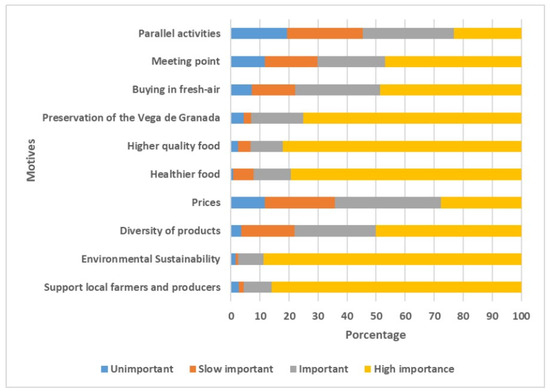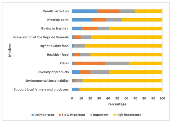 The third category, related to information on the customers’ motives for attending the Ecomercado, was measured by ranking options. The motives allow the Ecomercado organization to care about those reasons and increase the effort to consolidate these characteristics. In addition to this, it offers information on possible key questions to increase the popularity of farmers’ markets among the people of Granada.
