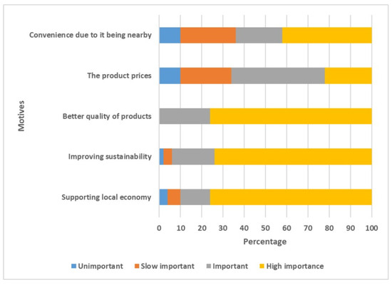 Customers were also asked about their motives for attending the Ecomercado. As shown in Figure 4, Figure 5, Figure 6, Figure 7 and Figure 8, in all the surveys, customers stated that their number one motive was to support the local economy, with the consideration of very important for the consumer decision ranging from 85 to 90%, except in the case of 2017, when this motive was the first one but only for 76%. The next main motive was to contribute to environmental sustainability with a similar percentage compared to the first case. Finally, to obtain higher quality and more healthy food was the third main motive, with a slightly lower percentage of consumers affirming that this was very important for them when buying at the farmer’s market (from 61% in 2014 to 85% in 2016).