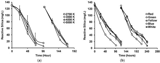 Figure 3a shows the reactive silica uptake by G. flavovirens Psetr3 in GWRS ROC using LED bulbs with four different color temperatures, namely 2700, 3000, 4000, and 5000 K (Table S1). Although there were slight variations and delays in reactive silica uptake in the first semi-batch cycle, there was no marked difference in the second cycle among those temperatures. The silica uptake rate, defined as the slope of the straight portion of the uptake curve [20], was 39 ± 2 mg/L/day, including all the data presented in Figure 3a. Studies showed that algae generally grew better in blue and red light, since the light-harvesting pigments chlorophylls a and b are more sensitive to those colors [24,32]. However, in this study, those LED bulbs emitting stronger blue light (4000 and 5000 K) did not appear to be better than those emitting weaker blue light (2700 and 3000 K).
