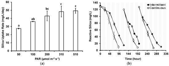 Shi et al. [21] reported that the growth and silica uptake could be accelerated with higher PAR (80 µmol m−2 s−1) in freshwater diatoms such as Cyclotella meneghiniana, Stephanodiscus parvus, and Synedra acus compared with lower PAR (25 µmol m−2 s−1), although the growth of some strains that were adapted to low light intensity could be inhibited if the PAR was above 80 µmol m−2 s−1. In this study, higher PAR levels (200–300 µmol m−2 s−1) were found to be optimum (Figure 4a). These levels are much lower than the PAR of full sunlight during the daytime. The result of intermittent light study (Figure 4b) showed that continuous illumination would not be required. These findings indicate potential operation of the diatom PBRs using sunlight as a light source.