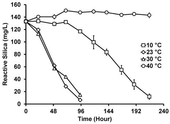 Reactive silica uptake by G. flavovirens Psetr3 in GWRS ROC at various temperatures. (10 W LED, 2700 K, PAR: 200 ± 5 µmol m−2 s−1, Runtime: 215 h) (Note: The error bars represent standard deviations of two replicates. Some error bars are too small to be visible).