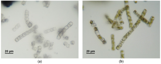 In addition to the ambient temperature (21–23 °C), the photobiological treatment of GWRS ROC at three additional temperatures at 10, 30, and 40 °C was evaluated (Figure 5). While there was no apparent difference in the reactive silica uptake rates between 23 and 30 °C, it was slower at 10 °C. Further, there was a prolonged lag period (three days) for the diatoms to acclimatize to the lower temperature. At 40 °C, no reactive silica uptake occurred, but a slight increase in concentration (up to 150 mg/L) was observed. The biomass lost dark green pigments upon incubation at 40 °C. The microscopic analysis confirmed that G. flavovirens Psetr3 cells were bleached (Figure 6a), as compared with the healthy cells grown at 23 °C (Figure 6b). It can be concluded that the optimum temperature of the photobiological treatment is around 23–30 °C.