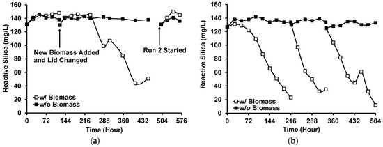 Reactive silica uptake by G. flavovirens Psetr3 in GWRS ROC using sunlight as a light source: (a) Runs 1 and 2 and (b) Run 3. (Temperature: 6–45 °C, PAR: Up to 1800 µmol m−2 s−1, Runtime: Run 1: 452 h; Run 2: 70 h; Run 3: 504 h).