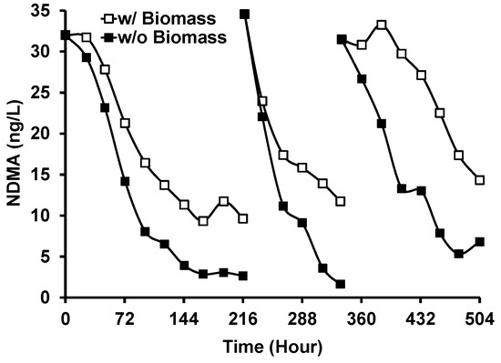 Figure 9 shows the removal of NDMA from GWRS ROC during Run 3 of the outdoor experiment with and without G. flavovirens Psetr3. The degradation of NDMA was slower in the vessel with G. flavovirens biomass. This suggests that the mechanism of NDMA degradation is primarily governed by direct photolysis and that the presence of biomass scavenged the photons available for NDMA photolysis. No degradation of NDMA was observed when LED light bulbs were used as a light source. This result contradicted our previous study, where significant NDMA removal (67%) was observed in LED-based photobiological treatment [18]. The previous result could have been an artifact or in error because LED light bulbs do not emit light at <300 nm (Figure S2), the wavelength absorbed by NDMA [28]. The photodegradation of N-nitrosamines (including NDMA) by natural sunlight is well known [34,35].