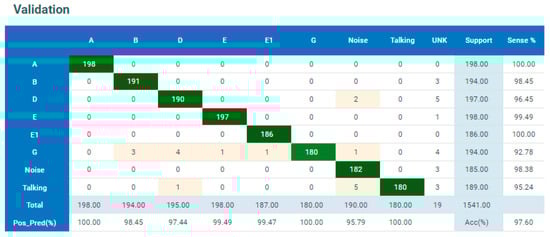 From Figure 4 and Figure 5, it can be inferred that the model achieved very good and similar performances both on the training dataset (data that the model has previously seen and provided during the training phase) and on the validation dataset, which the network has not seen before. The only erroneous predictions, also observed by the students, were regarding speech and only in specific cases—when the sound intensity was too low and there was background noise as well.