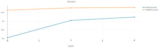 Multiple values were tested for the number of epochs, and through graphical analysis, it was concluded that the optimal number in terms of both training and prediction time, as well as accuracy, was 4. Figure 6 displays the accuracy obtained at each training and validation epoch. This analysis revealed that after 4 epochs, both accuracy and loss did not significantly improve further.