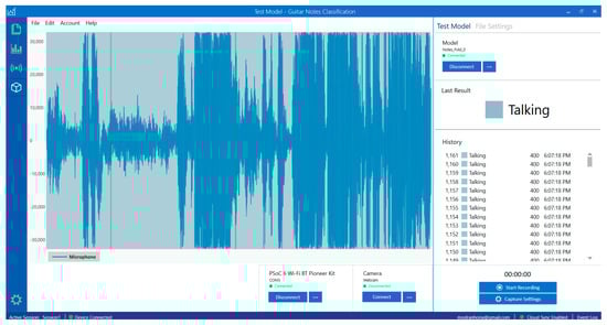 Before deploying the Machine Learning model on the IoT device, predictions can be visualized in real-time in the Data Capture Lab. The application will run the model on the data captured in real time by the microphone connected to the PSoC 6 device. The classification results generated by the model are added to the history and can be graphically visualized in real-time, along with the latest prediction made (Figure 6).