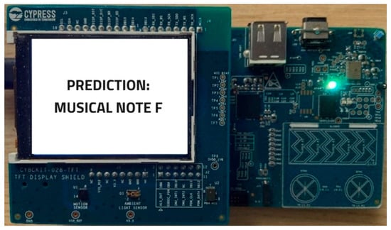 The application program on the PSoC 6 sends real-time predictions via UART, which can be visualized by students either through Putty or Open Gateway or on the TFT screen connected to the PSoC6 (Figure 7). Through Open Gateway, a serial connection can be established to the COM port allocated to the IoT device. After establishing the connection, in the testing mode, the current prediction is displayed along with the history of previous predictions.
