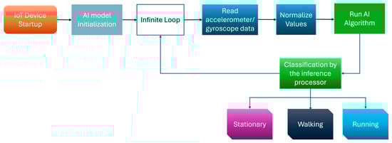 The operation of the application was described and explained to the students through a block diagram (Figure 9). In an infinite loop, the IoT device reads data from a motion sensor (BMX160, Bosch Sensortec, Reutlingen, Germany) attached to the PSoC 6 to detect activities. The dataset consists of orientation data on 3 axes from both accelerometer and gyroscope. A timer is configured to interrupt at 128 Hz. The interrupt handler reads all 6 axes via SPI and signals a data processing task when the internal buffer has 128 new samples. It applies an IIR filter and min-max normalization to 128 samples simultaneously. These processed data are then transmitted to the inference processor. The inference processor determines and returns the prediction confidence for each activity class. If the confidence exceeds an 80% threshold, the predicted activity is displayed on the UART terminal. This application utilizes FreeRTOS. Within it, a system task—the activity task—was defined and executed, which processes received data and forwards it to the ML model.