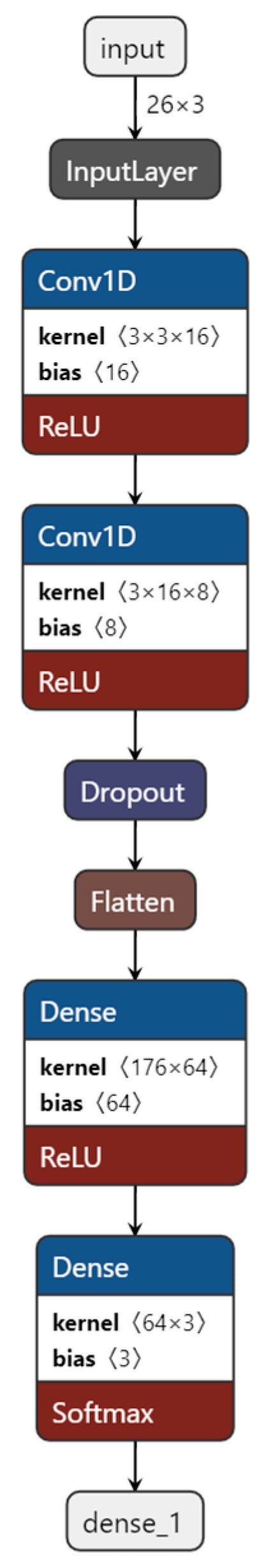 Each convolutional block includes convolutional operations, including Rectified Linear Unit (ReLU) activation and the dropout layer, with the addition of a flattened layer after the first block. The convolutional layers act as feature extractors and provide abstract representations of input sensor data in the feature map. They capture short-term dependencies (spatial relationships) in the data. In the developed network, features are extracted and then used as inputs to a fully connected network, using Softmax activation for classification.