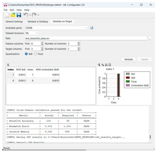 Following this, the generated model was programmed by students onto the device for testing. The ML Configurator also shows the resources consumed by the model, which are suitable for any microcontroller. The model was validated on PC, yielding very good results for both 8 × 8 and floating-point quantization. Before being programmed onto the PSoC 6 device, the model needs to be checked to validate if it is optimized for the available hardware on that device. Following the validation performed in the ML Configurator, a 100% accuracy, and 0.01 prediction error were achieved (Figure 13).