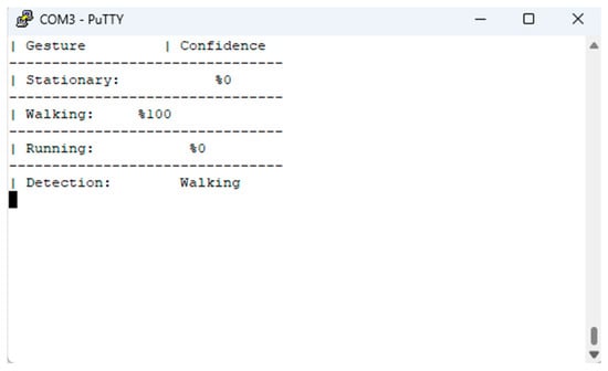 After programming the device, through the serial connection to the computer, it displays on the UART terminal the prediction in real-time, together with the confidence percentage for each class (Figure 14).