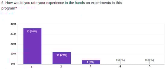 Student feedback was collected through an online anonymous survey on Google Forms (https://docs.google.com/forms/d/e/1FAIpQLSdkXBucogpGud5ceaS7ptIiwNPBMZ3U-YWk0dDRZfoQuHTPdQ/viewform?vc=0&c=0&w=1&flr=0, accessed on 10 May 2024). Students expressed positive responses so far, appreciating the proposed approach, finding the practical experiments helpful for better understanding theoretical concepts and rating the experience with a high grade (Figure 15). Most of the respondents were overall satisfied with this learning experience, but they identified few aspects of the educational framework that could be improved, which will be included for the further development of this framework: