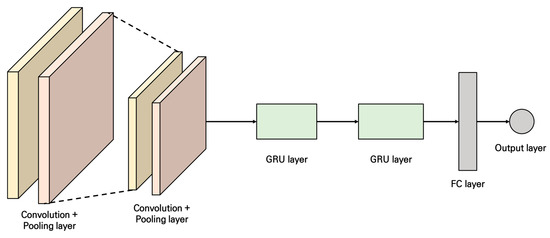 Recently, research on hybrid models that combine multiple DL models to extract features from data and perform forecasting has been ongoing. The CNN-GRU used in this study is a hybrid model that combines an upper-layer convolutional neural network (CNN) and a lower-layer gated recurrent unit (GRU) into a single model, as illustrated in Figure 2. When a GRU is used alone, there are limitations to properly reflecting the characteristics of the data. Therefore, a hybrid model approach combining a CNN and GRU has recently been adopted [34]. The characteristics of each model are as follows.
