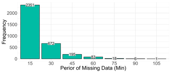Figure 4 illustrates an example visualizing the frequency of occurrence of missing data generated. Frequency analysis was conducted to represent one of the generated cases mentioned above. Missing data that occur at one point indicates a duration of 15 min, and the result was calculated by multiplying 15 min by the number of consecutive occurrences of missing data. In total, 3326 instances of missing data occurred over the course of a year, and multiple points where missing data occurred 2 or more times consecutively accounted for 29.3% of the total. The longest duration of missing data was 105 min, which occurred continuously in 6 instances.