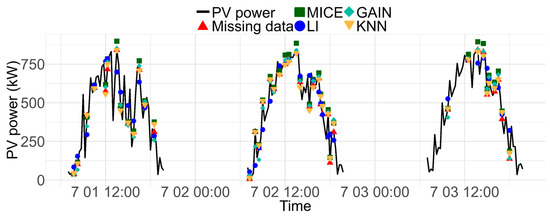 The imputation methods LI, MICE, KNN, and GAIN were each applied to the simulated missing data. While LI, MICE, and KNN utilized R for implementation, GAIN was executed using Python. Figure 5 displays the imputation process during a period characterized by significant variability in PV power from 1 July 2022 to 3 July 2022. For all methods except LI, additional weather-related variables such as inclined and horizontal solar radiation, module and ambient temperatures, and sky status were employed. These variables were consistently utilized across all imputation methods to ensure coherence in the development of the forecasting model. The measured PV power and the results of the imputation are depicted as a solid line and dots, respectively.