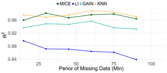 Figure 6 illustrates the variation in imputation performance as the duration of missing data extends. At a missing data rate of 30% and using an R2 metric, we observed a performance degradation in LI from 0.896 to 0.839 as missing intervals lengthened. Conversely, KNN and the MICE exhibited more stable performances, with KNN ranging from 0.976 to 0.971 and the MICE from 0.960 to 0.964, suggesting no significant declining trend. Thus, in this case, KNN and the MICE remained minimally affected by the duration of missing data.