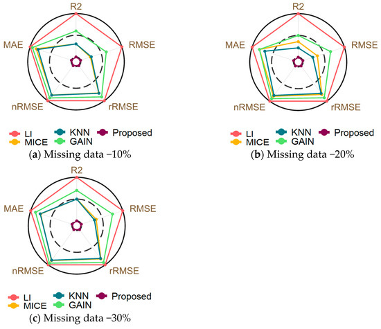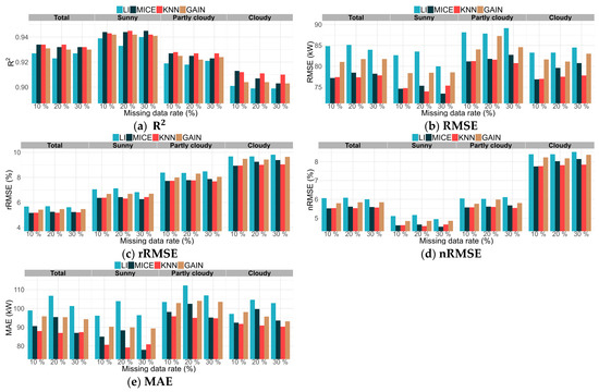 Figure 7a presents a visualization of the results based on R2. When comparing situations with a 30% missing data rate, the models with LI, MICE, KNN, and GAIN applied show values of 0.927, 0.932, 0.932, and 0.930, respectively, based on the “Total” criterion. Models with high imputation performances, particularly those with KNN and MICE, demonstrated improved performances. However, when comparing and analyzing weather conditions in detail, models with MICE, KNN, and KNN applied showed higher performance in “Sunny”, “Partly cloudy”, and “Cloudy”, respectively.