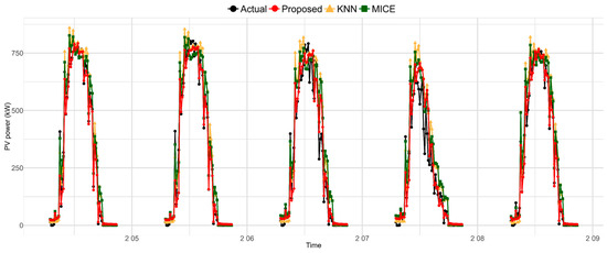 Figure 8 exemplifies the comparative effectiveness of the proposed model against established KNN and MICE models, particularly under a scenario with a 30% missing data rate. This visualization highlights how the proposed model more accurately approximates actual PV power outputs during peak hours (12–13 h) and under challenging weather conditions, such as those on 7 February 2023. Notably, the proposed model significantly reduces over-predictions commonly observed in traditional models, showcasing its robustness and reliability in handling missing data efficiently.