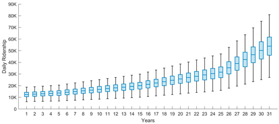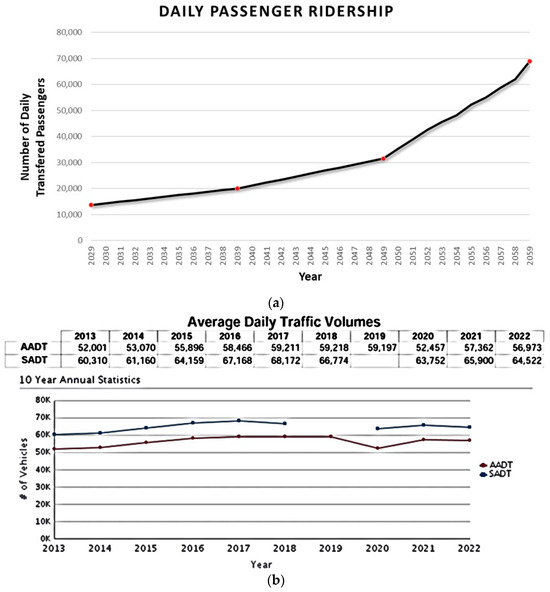 Figure 2 presents two aspects related to expected ridership, including (a) OVER PR ridership forecasts for the years 2029−2059 by Boozarjomehri [29] (at 13,600 and 70,000 per day, respectively) and (b) average traffic volumes on Highway 97 at its busiest point in Kelowna for the years 2013−2022 from provincial counts, ranging from 52,000 to 57,000 per day (and 10% busier each summer).