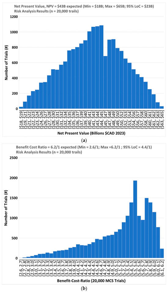 From Table 2 and industry sources, adjusting for inflation for 2023 and economies of scale, an expected centerline cost of CAD 5 million per kilometer was used for this study, ranging from CAD 3 million (P = 0.2) to CAD 10 million (CAD 0.3). Admittedly, these costs appear low relative to shorter length, in-city track sections. For example, a 3.3 km tram segment in Hannover City was just built for EUR 90 million (roughly CAD 45 million/km), reflecting significant property acquisition and high costs of retrofitting streets in cities, versus in rural areas outside of cities [17]. Economy of scale, use of modular construction techniques, and staying within the highway right-of-way over the much longer 342-km tram segment in this case, most of which is outside cities, could reasonably be expected to lead to significant cost savings in this range [48]. Regardless, all numbers were subjected to Class-reference forecasting and Monte Carlo Simulation risk analyses using the min/max values listed in Table 1 above [48].