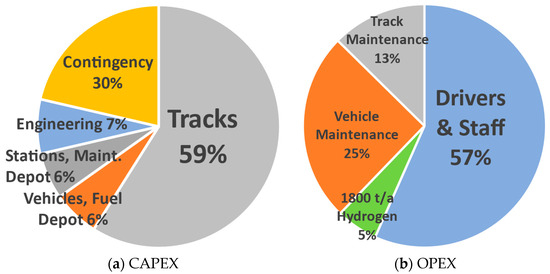 The rail infrastructure costs of the train-tram systems examined in Bremen, Germany; Bern, Switzerland; and in Plock, Poland were averaged to estimate railway construction costs. These transport systems’ cost per kilometer-track assessments included relevant railway infrastructure components only, all of which were much shorter double-track routes than OVER PR’s 342-km route. Other CAPEX associated with turnouts, railway signals, and communications were taken from peer reviewed sources [46,47,48,49]. Consistent with the Karlsruhe tram-train implementation history, initial track costs assumed a single dedicated set of rails (single track) running the entire 342-km route between Osoyoos and Kamloops, with double tracks where needed (i.e., passing sidings and at stations) to permit opposing tram-trains to pass mid-route.