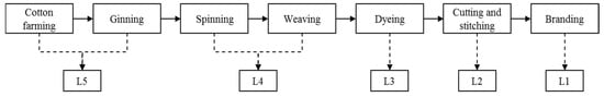 IKEA China’s cotton-textile supply chain consists of six processes: cotton farming, ginning, spinning, weaving, dyeing, and cutting and stitching. These six processes are carried out at five levels in IKEA China’s SCL network (as in Figure 1): the first level (L1) consists of the focal firm in the supply chain network, i.e., IKEA China, where the branding is implemented here.; the second level (L2) is comprised of the cutting and stitching supplier (a T1 supplier), which is a tier-one supplier that receives training directly from IKEA China; the third level (L3) consists of the dyeing supplier, which is contacted by the tier-one supplier (L3 is thus a T2 supplier); the fourth level (L4) includes the weaving and spinning suppliers (T3 and T4 suppliers) that interact with T1 and T2 suppliers; the fifth and last level (L5) is comprised of ginners and cotton farmers (T5 and T6 suppliers, respectively), with which IKEA China has direct contact and/or collaborates with in the form of third-party knowledge providers, such as the Better Cotton Initiative (BCI), which is a third-party non-governmental organization (NGO). Depending on the specialization of suppliers, the various activities in the supply chain (ginning, spinning, weaving, dyeing, cutting and stitching) may be covered in different combinations by suppliers.