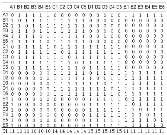 The relationship matrix corresponding to Figure 2 is shown in Figure 3. The letters A, B, C, D, and E represent the IKEA supply chain levels from L1 to L5, respectively. There are 5 suppliers each at theL2, L3, and L4 links, and 6 atL5. We plotted their learning relationships in Figure 3 and determine the degree of the corresponding node enterprise in the supply chain as = [11, 10, 10, 10, 10, 10, 14, 14, 14, 14, 14, 15, 15, 15, 15, 15, 15, 11, 11, 11, 11, 11, 11, 11].